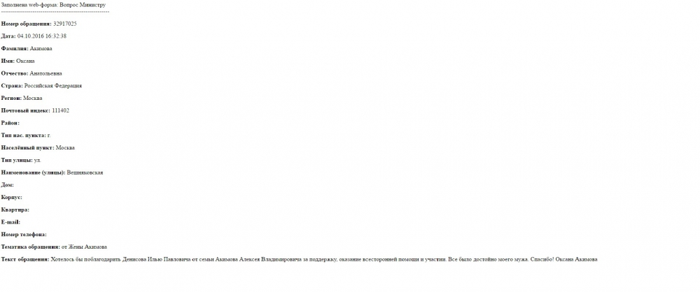 Хотелось бы поблагодарить Денисова Илью Павловича от семьи Акимова Алексея Владимировича за поддержку, оказание всесторонней помощи и участии. Все было достойно моего мужа. Спасибо!