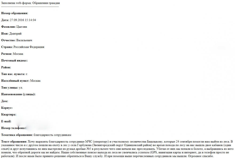 Хочу выразить благодарность сотруднице МЧС (оператору) и участковому лесничества Башлыкову, которые 24 сентября помогли нам выйти из леса. В указанное число я с другом пошли на охоту в лес у села Горбунова (Звенигородский округ Одинцовский район) во время похода по лесу на нас вышла двое кабанов (один секач) и друг испугавшись по ним выстрелил из ружья дробью №5 в результате чего они начали нас преследовать. Убегая от них мы попали в болото, а выбравшись из него поняли, что обратной дороги мы не найдем. Наши собственные поиске выхода из леса не увенчались успехом (GPS, навигация карты и интернет, да и телефон просто не работали). И после нами было принято решение обратиться в Вашу службу. И при помощи выше перечисленных сотрудников мы вышли. Огромное спасибо.