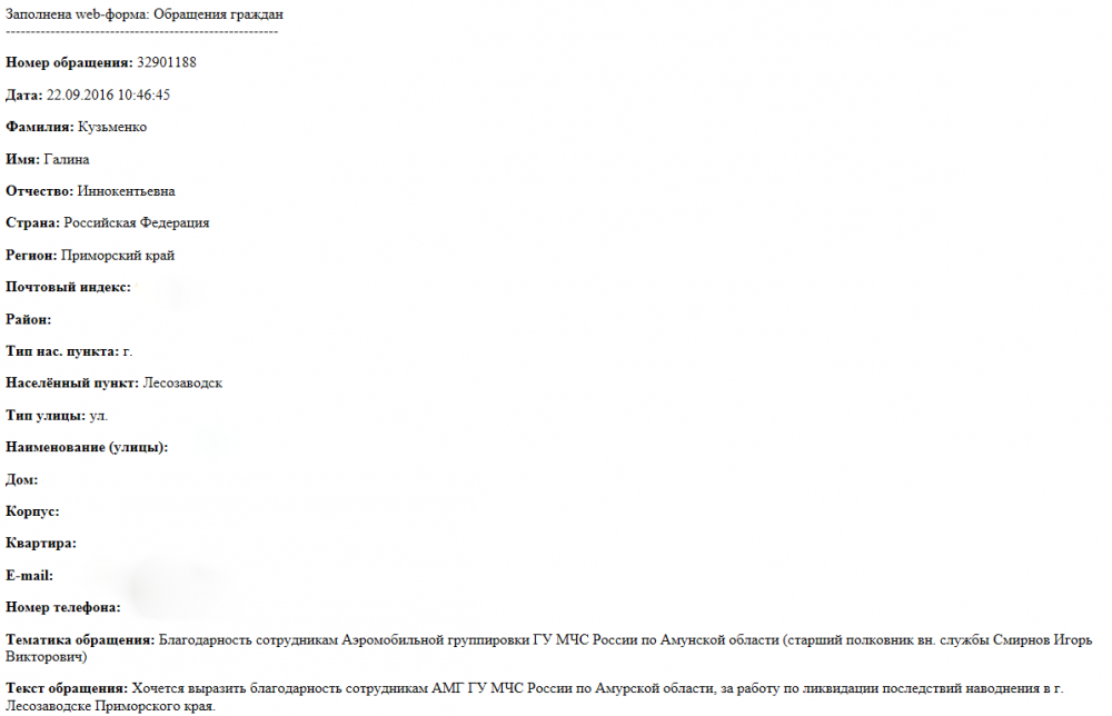 Хочется выразить благодарность сотрудникам АМГ ГУ МЧС России по Амурской области, за работу по ликвидации последствий наводнения в г. Лесозаводске Приморского края.