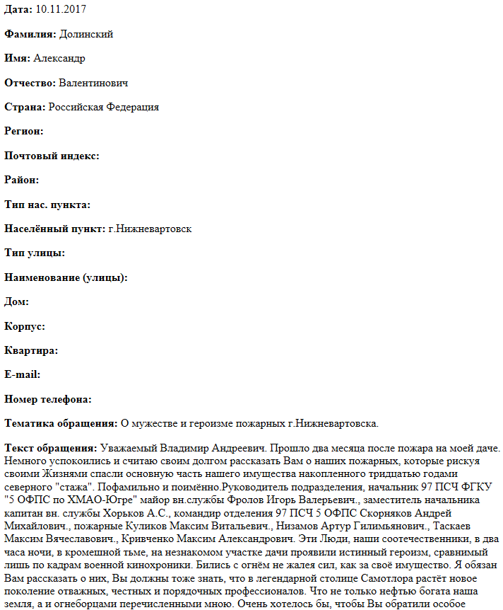 Уважаемый Владимир Андреевич. Прошло два месяца после пожара на моей даче. Немного успокоились и считаю своим долгом рассказать Вам о наших пожарных, которые рискуя своими Жизнями спасли основную часть нашего имущества накопленного тридцатью годами северного "стажа". Пофамильно и поимённо.Руководитель подразделения, начальник 97 ПСЧ ФГКУ "5 ОФПС по ХМАО-Югре" майор вн.службы Фролов Игорь Валерьевич., заместитель начальника капитан вн. службы Хорьков А.С., командир отделения 97 ПСЧ 5 ОФПС Скорняков Андрей Михайлович., пожарные Куликов Максим Витальевич., Низамов Артур Гилимьянович., Таскаев Максим Вячеславович., Кривченко Максим Александрович. Эти Люди, наши соотечественники, в два часа ночи, в кромешной тьме, на незнакомом участке дачи проявили истинный героизм, сравнимый лишь по кадрам военной кинохроники. Бились с огнём не жалея сил, как за своё имущество. Я обязан Вам рассказать о них, Вы должны тоже знать, что в легендарной столице Самотлора растёт новое поколение отважных, честных и порядочных профессионалов. Что не только нефтью богата наша земля, а и огнеборцами перечисленными мною. Очень хотелось бы, чтобы Вы обратили особое внимание на моё письмо и с высоты Вашего положения и звания поблагодарили бы их. Как это Вы сделаете я не знаю, но очень жду, ждём, вся моя семья. Ну а от пережитого потрясения сердце моё дало какой то сбой и тринадцатого ноября этого года уезжаю в кардиологический Центр г.Сургута на операцию. Что ждёт там меня,не знаю. А Вам искренне Спасибо! Именно благодаря таким как Вы, в разных уголках нашей страны есть такие преданные профессии, служебному и Человеческому долгу самородки. С огромным уважением к Вам Ветеран труда России, старожил г.Нижневартовска, из категории первопроходцев освоения Западной Сибири Александр Долинский. С наступающим Новым 2018 годом уважаемый Владимир Андреевич! Счастья Вам по Жизни желаем, Мы Вас знаем, любим и уважаем! Счастья и Добра желаем!!!
