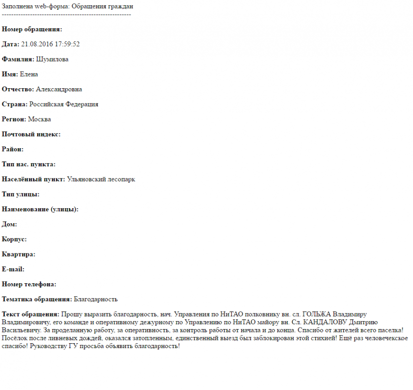 Прошу выразить благодарность, нач. Управления по НиТАО полковнику вн. сл. ГОЛЬЖА Владимиру Владимировичу, его команде и оперативному дежурному по Управлению по НиТАО майору вн. Сл. КАНДАЛОВУ Дмитрию Васильевичу. За проделанную работу, за оперативность, за контроль работы от начала и до конца. Спасибо от жителей всего паселка! Посёлок после ливневых дождей, оказался затопленным, единственный выезд был заблокирован этой стихией! Ещё раз человечекское спасибо! Руководству ГУ просьба объявить благодарность!