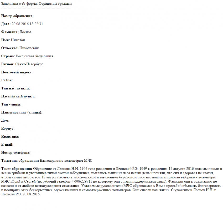 Обращение от Леонова Н.Н. 1946 года рождения и Леоновой Р.Э. 1949 г. рождения. 17 августа 2016 года мы пошли в лес за грибами и увлёкшись тихой охотой заблудились, пытались выйти из леса целый день и поняли, что сил и здоровья не хватит, чтобы самим выбраться. 18 августа ночью в заболоченном и заваленном буреломом лесу нас нашли и помогли выбраться волонтёры МЧС Юрий и Сергей (их рабочий телефон +7906229711 по которому они с нами поддерживали связь). Фамилии они к сожалению не назвали и от любого вознаграждения отказались. Уважаемые руководители МЧС обращаемся к Вам с просьбой объявить благодарность и поощрить этих бескорыстных, мужественных и самоотверженных волонтёров. Они спасли нам жизнь. С уважением Леонов Н.Н. и Леонова Р.Э. 20.08.2016.