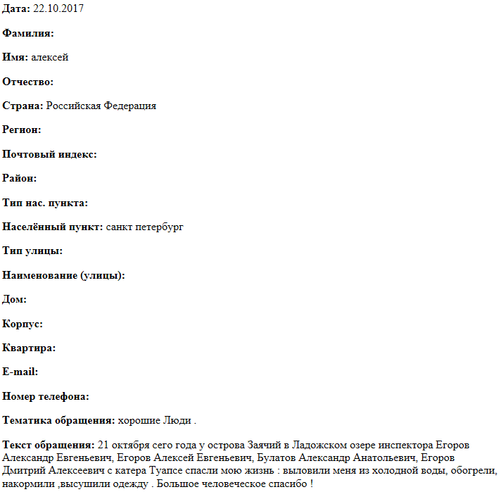 21 октября сего года у острова Заячий в Ладожском озере инспектора Егоров Александр Евгеньевич, Егоров Алексей Евгеньевич, Булатов Александр Анатольевич, Егоров Дмитрий Алексеевич с катера Туапсе спасли мою жизнь: выловили меня из холодной воды, обогрели, накормили, высушили одежду. Большое человеческое спасибо !