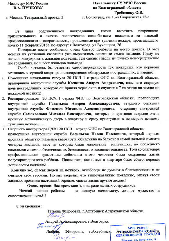 Благодарность спасателям 20 ПСЧ по Волгоградской области за мужество и самоотверженность при тушении пожара