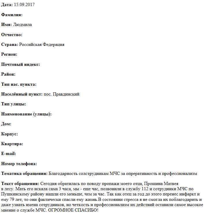 Сегодня обратилась по поводу пропажи моего отца, Прошина Матвея в лесу. Мать его искала сама 3 часа, мы - еще час, позвонили в службу 112 и сотрудники МЧС России по Пушкинскому району нашли его меньше, чем за час. Так как отец за год до этого перенес инфаркт и ему 79 лет, то они фактически спасли ему жизнь.В состоянии стресса я не смогла их поблагодарить и даже узнать имена сотрудников, но четкость и профессионализм их действий оставили самое высокое мнение о службе МЧС России. ОГРОМНОЕ СПАСИБО!
