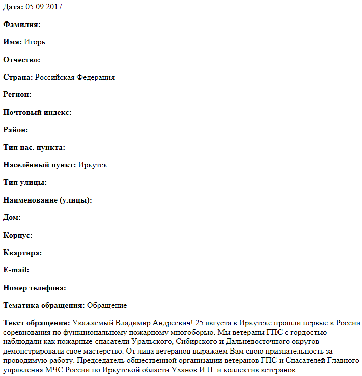 Уважаемый Владимир Андреевич! 25 августа в Иркутске прошли первые в России соревнования по функциональному пожарному многоборью. Мы ветераны ГПС с гордостью наблюдали как пожарные-спасатели Уральского, Сибирского и Дальневосточного округов демонстрировали свое мастерство. От лица ветеранов выражаем Вам свою признательность за проводимую работу. Председатель общественной организации ветеранов ГПС и Спасателей Главного управления МЧС России по Иркутской области Уханов И.П. и коллектив ветеранов.