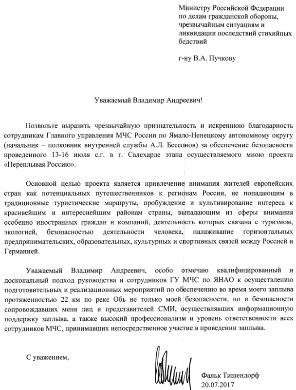 Позвольте выразить чрезвычайную признательность и искреннюю благодарность сотрудникам Главного управления МЧС России по Ямало-Ненецкому автономному округу (начальник - полковник внутренней службы А.Л. Бессонов) за обеспечение безопасности проведенного 13-16 июля с.г. в г. Салехарде этапа осуществляемого мною проекта «Переплывая Россию». Основной целью проекта является привлечение внимания жителей европейских стран как потенциальных путешественников к регионам России, не попадающим в традиционные туристические маршруты, пробуждение и культивирование интереса к красивейшим и интереснейшим районам страны, выпадающим из сферы внимания особенно иностранных граждан и компаний‚ деятельность которых связана с туризмом, экологией, безопасностью деятельности человека, налаживание горизонтальных предпринимательских, образовательных, культурных и спортивных связей между Россией и Германией. Уважаемый Владимир Андреевич, особо отмечаю квалифицированный и доскональный подход руководства и сотрудников ГУ МЧС России по ЯНАО к осуществлению подготовительных и реализационных мероприятий по обеспечению во время моего заплыва протяженностью 22 км по реке Обь не только моей безопасности, но и безопасности сопровождавших меня лиц и представителей СМИ, осуществлявших информационную поддержку заплыва, а также высокий профессионализм и уровень ответственности всех сотрудников МЧС России, принимавших непосредственное участие в проведении заплыва.