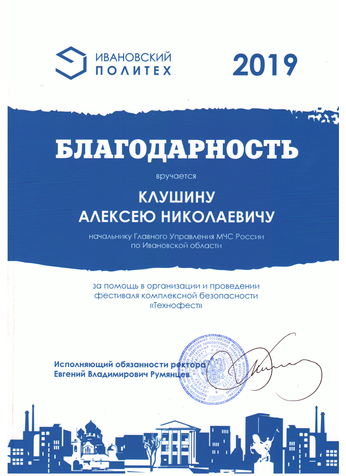 Кафедра техносферной безопасности ФГБОУ ВО "Ивановский государственный политехнический университет" выражает благодарность Начальнику Главного управления МЧС России по Ивановской области Клушину Алексею Николаевичу за методическую и организационную поддержку при проведении Ивановского областного фестиваля комплексной безопасности "Технофест 2019".