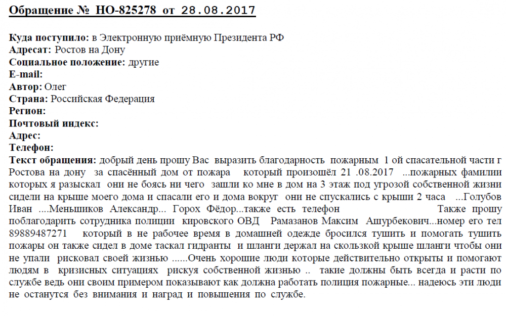 Добрый день прошу Вас выразить благодарность пожарным 1-ой спасательной части г. Ростова-на-дону за спасѐнный дом от пожара который произошѐл 21.08.2017 ...пожарных фамилии