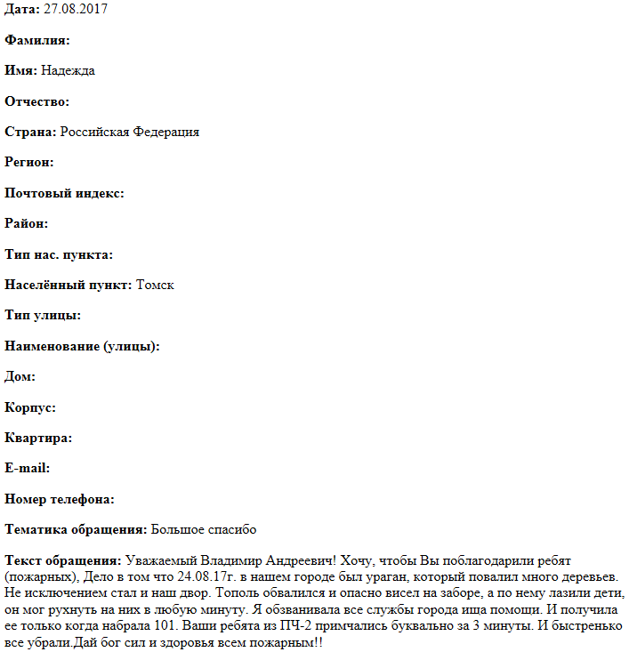 Уважаемый Владимир Андреевич! Хочу, чтобы Вы поблагодарили ребят (пожарных), Дело в том что 24.08.17г. в нашем городе был ураган, который повалил много деревьев. Не исключением стал и наш двор. Тополь обвалился и опасно висел на заборе, а по нему лазили дети, он мог рухнуть на них в любую минуту. Я обзванивала все службы города ища помощи. И получила ее только когда набрала 101. Ваши ребята из ПЧ-2 примчались буквально за 3 минуты. И быстренько все убрали. Дай бог сил и здоровья всем пожарным!!