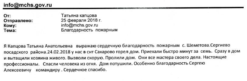 Выражаю благодарность сотрудникам МЧС Липецкой области г. Чаплыгина за оказанную помощь в поднятии тяжелобольной мамы на второй этаж местной больницы. К сожалению, в местной больнице нет никаких условий для передвижения тяжёлых больных, прошу местное МЧС откликаться на такого рода помощь. В моем случае приехали оперативно, подняли аккуратно, сработали слаженно. Спасибо вам большое за ваш труд! Пусть дежурства будут спокойными!