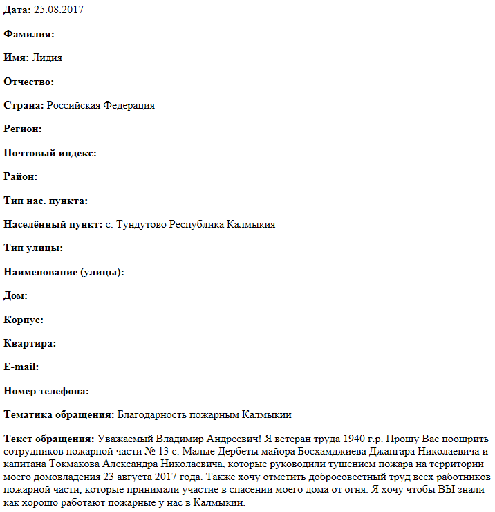 Уважаемый Владимир Андреевич! Я ветеран труда 1940 г.р. Прошу Вас поощрить сотрудников пожарной части № 13 с. Малые Дербеты майора Босхамджиева Джангара Николаевича и капитана Токмакова Александра Николаевича, которые руководили тушением пожара на территории моего домовладения 23 августа 2017 года. Также хочу отметить добросовестный труд всех работников пожарной части, которые принимали участие в спасении моего дома от огня. Я хочу чтобы ВЫ знали как хорошо работают пожарные у нас в Калмыкии.