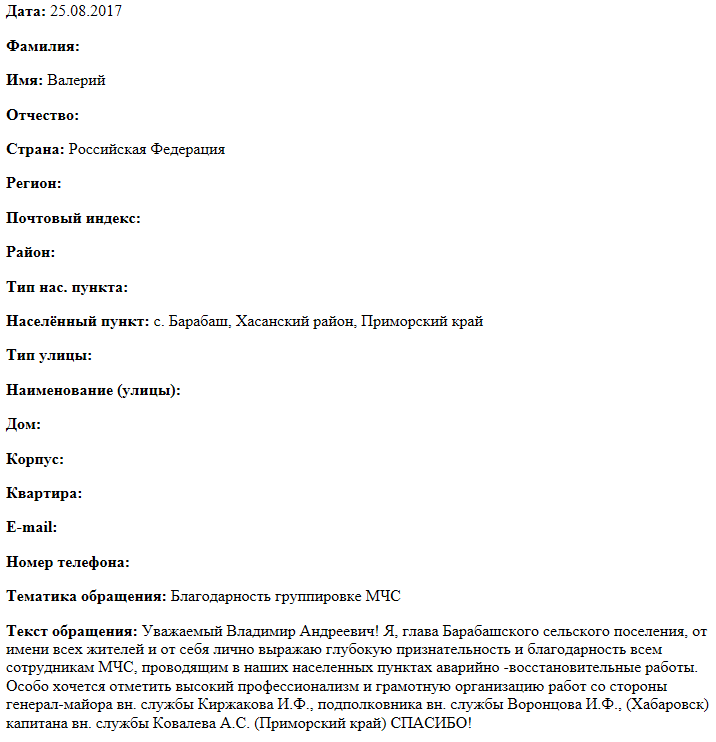 Уважаемый Владимир Андреевич! Я, глава Барабашского сельского поселения, от имени всех жителей и от себя лично выражаю глубокую признательность и благодарность всем сотрудникам МЧС, проводящим в наших населенных пунктах аварийно -восстановительные работы. Особо хочется отметить высокий профессионализм и грамотную организацию работ со стороны генерал-майора вн. службы Киржакова И.Ф., подполковника вн. службы Воронцова И.Ф., (Хабаровск) капитана вн. службы Ковалева А.С. (Приморский край) СПАСИБО!
