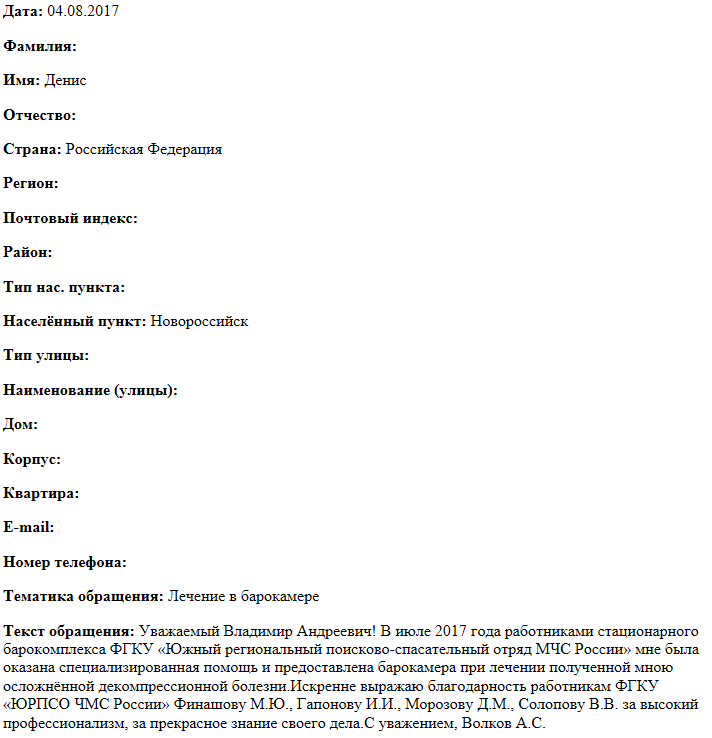 Уважаемый Владимир Андреевич! В июле 2017 года работниками стационарного барокомплекса ФГКУ «Южный региональный поисково-спасательный отряд МЧС России» мне была оказана специализированная помощь и предоставлена барокамера при лечении полученной мною осложнённой декомпрессионной болезни. Искренне выражаю благодарность работникам ФГКУ «ЮРПСО МЧС России» Финашову М.Ю., Гапонову И.И., Морозову Д.М., Солопову В.В. за высокий профессионализм, за прекрасное знание своего дела. С уважением, Волков А.С.