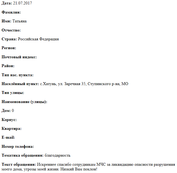 Искреннее спасибо сотрудникам МЧС за ликвидацию опасности разрушения моего дома, угрозы моей жизни. Низкий Вам поклон!