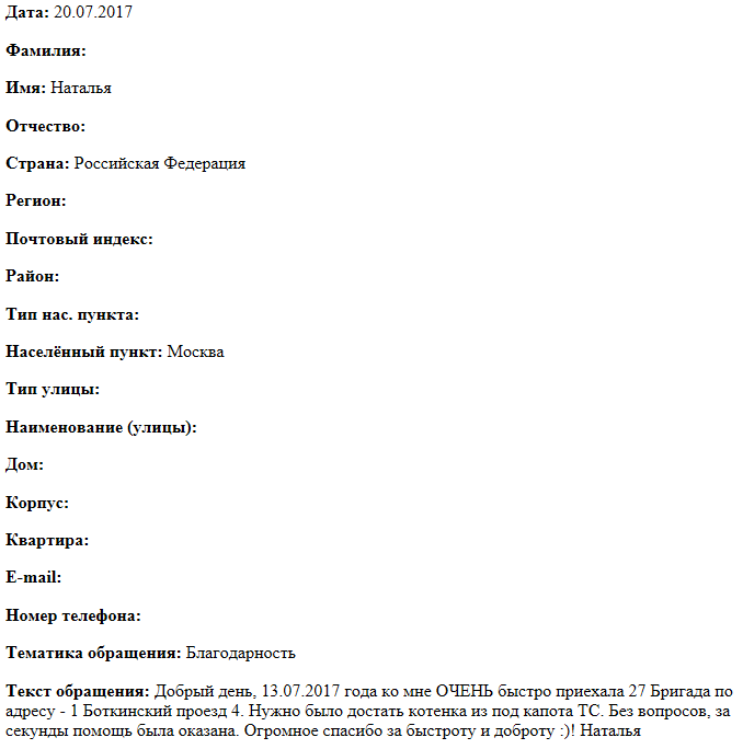 Добрый день, 13.07.2017 года ко мне ОЧЕНЬ быстро приехала 27 Бригада по адресу - 1 Боткинский проезд 4. Нужно было достать котенка из под капота ТС. Без вопросов, за секунды помощь была оказана. Огромное спасибо за быстроту и доброту :)! Наталья