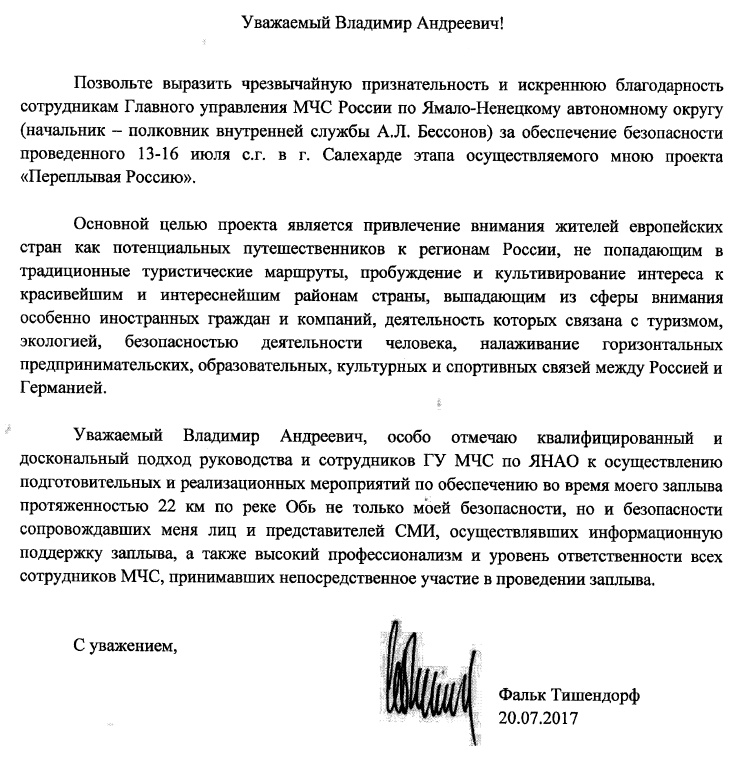Уважаемый Владимир Андреевич! Позвольте выразить чрезвычайную признательность и искреннюю благодарность сотрудникам Главного управления МЧС России по Ямало-Ненецкому автономному округу (начальник - полковник внутренней службы А.Л. Бессонов) за обеспечение безопасности проведенного 13-16 июля с.г. в г. Салехарде этапа осуществляемого мною проекта «Переплывая Россию». Основной целью проекта является привлечение внимания жителей европейских стран как потенциальных путешественников к регионам России, не попадающим в традиционные туристические маршруты, пробуждение и культивирование интереса к красивейшим и интереснейшим районам страны, выпадающим из сферы внимания особенно иностранных граждан и компаний, деятельность которых связана с туризмом, экологией, безопасностью деятельности человека, налаживание горизонтальных предпринимательских, образовательных, культурных и спортивных связей между Россией и Германией.