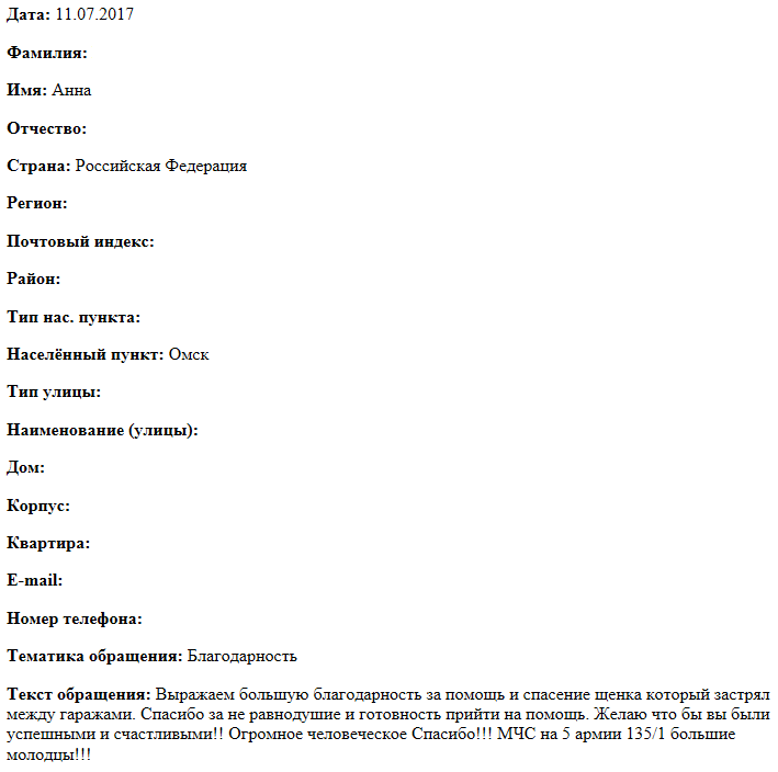 Выражаем большую благодарность за помощь и спасение щенка который застрял между гаражами. Спасибо за не равнодушие и готовность прийти на помощь. Желаю что бы вы были успешными и счастливыми!! Огромное человеческое Спасибо!!! МЧС на 5 армии 135/1 большие молодцы!!!