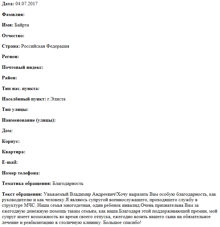 Уважаемый Владимир Андреевич! Хочу выразить Вам особую благодарность, как руководителю и как человеку.Я являюсь супругой военнослужащего, проходящего службу в структуре МЧС. Наша семья многодетная, один ребенок инвалид.Очень признательна Вам за ежегодную денежную помощь таким семьям, как наша.Благодаря этой поддерживающей премии, мой супруг имеет возможность во время своего отпуска, ежегодно возить нашего сына на обязательное лечение и реабилитацию в столичную клинику. Большое спасибо!