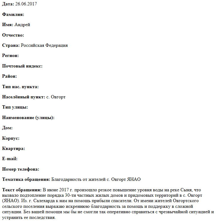 В июне 2017 г. произошло резкое повышение уровня воды на реке Сыня, что вызвало подтопление порядка 30-ти частных жилых домов и придомовых территорий в с. Овгорт (ЯНАО). Из г. Салехарда к нам на помощь прибыли спасатели. От имени жителей Овгортского сельского поселения выражаю искреннюю благодарность за помощь и поддержку в сложной ситуации. Без вашей помощи мы бы не смогли так оперативно справиться с чрезвычайной ситуацией и устранить ее последствия.