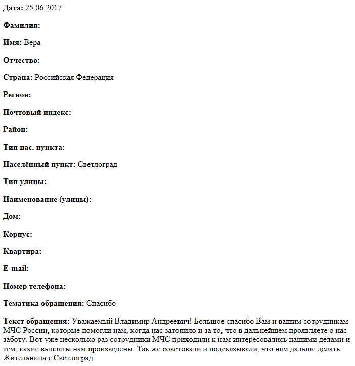 Уважаемый Владимир Андреевич! Большое спасибо Вам и вашим сотрудникам МЧС России, которые помогли нам, когда нас затопило и за то, что в дальнейшем проявляете о нас заботу. Вот уже несколько раз сотрудники МЧС приходили к нам интересовались нашими делами и тем, какие выплаты нам произведены. Так же советовали и подсказывали, что нам дальше делать. Жительница г.Светлоград.