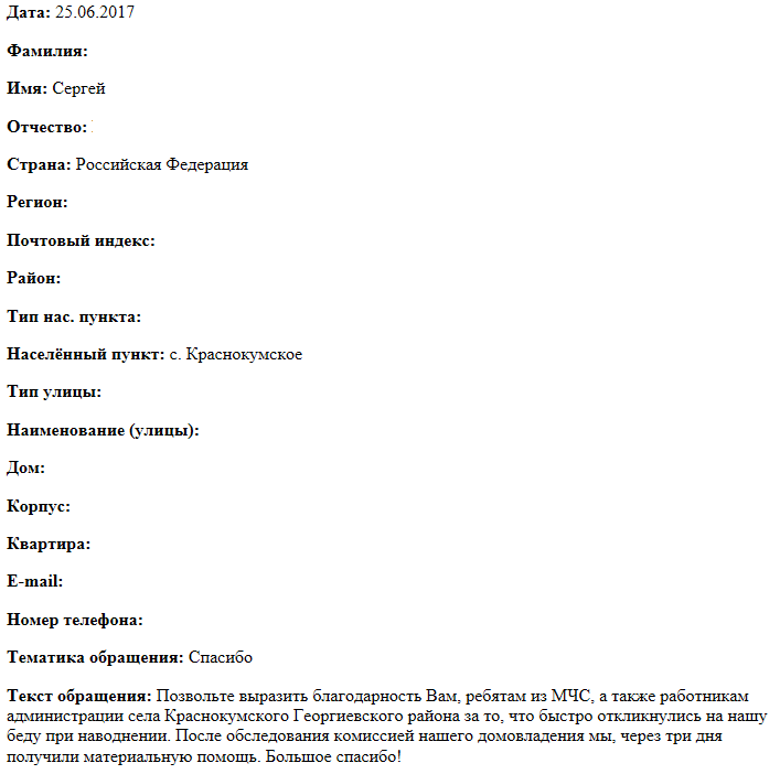 Позвольте выразить благодарность Вам, ребятам из МЧС, а также работникам администрации села Краснокумского Георгиевского района за то, что быстро откликнулись на нашу беду при наводнении. После обследования комиссией нашего домовладения мы, через три дня получили материальную помощь. Большое спасибо!
