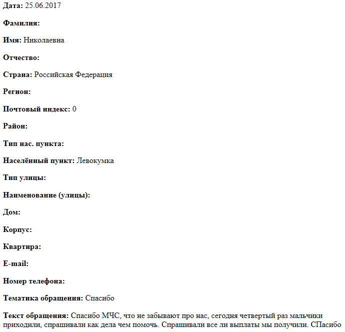 Спасибо МЧС, что не забывают про нас, сегодня четвертый раз мальчики приходили, спрашивали как дела чем помочь. Спрашивали все ли выплаты мы получили. Спасибо.