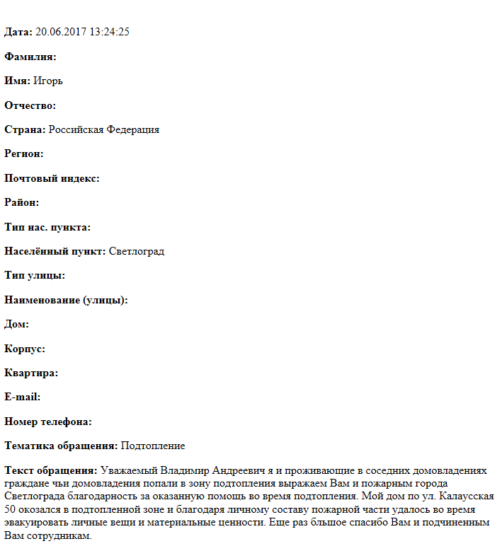 Уважаемый Владимир Андреевич я и проживающие в соседних домовладениях граждане чьи домовладения попали в зону подтопления выражаем Вам и пожарным города Светлограда благодарность за оказанную помощь во время подтопления. Мой дом по ул. Калаусская 50 окозался в подтопленной зоне и благодаря личному составу пожарной части удалось во время эвакуировать личные вещи и материальные ценности. Еще раз большое спасибо Вам и подчиненным Вам сотрудникам.