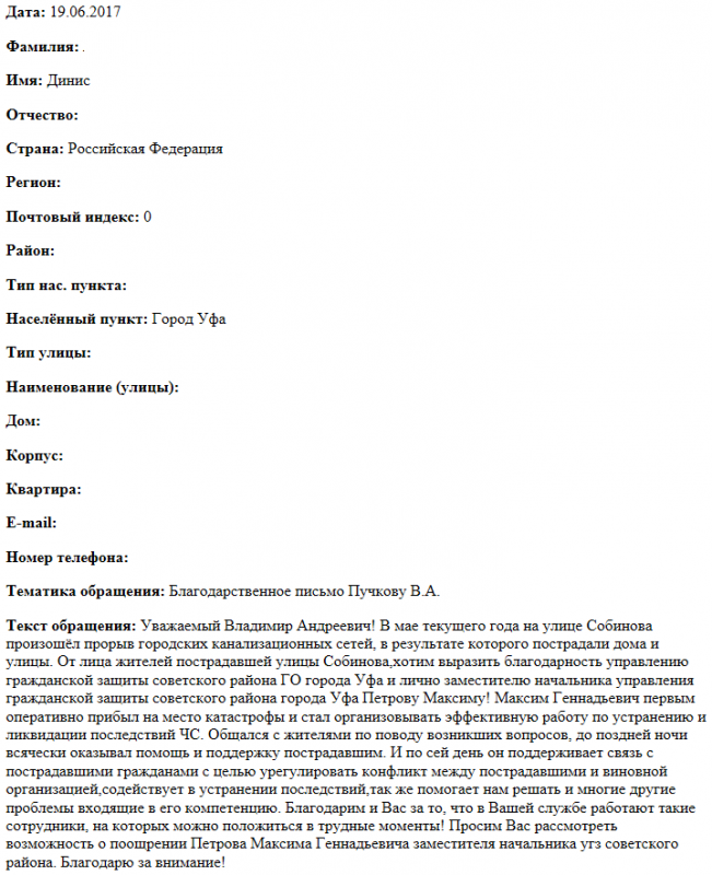 Уважаемый Владимир Андреевич! В мае текущего года на улице Собинова произошёл прорыв городских канализационных сетей, в результате которого пострадали дома и улицы. От лица жителей пострадавшей улицы Собинова,хотим выразить благодарность управлению гражданской защиты советского района ГО города Уфа и лично заместителю начальника управления гражданской защиты советского района города Уфа Петрову Максиму! Максим Геннадьевич первым оперативно прибыл на место катастрофы и стал организовывать эффективную работу по устранению и ликвидации последствий ЧС. Общался с жителями по поводу возникших вопросов, до поздней ночи всячески оказывал помощь и поддержку пострадавшим. И по сей день он поддерживает связь с пострадавшими гражданами с целью урегулировать конфликт между пострадавшими и виновной организацией,содействует в устранении последствий,так же помогает нам решать и многие другие проблемы входящие в его компетенцию. Благодарим и Вас за то, что в Вашей службе работают такие сотрудники, на которых можно положиться в трудные моменты! Просим Вас рассмотреть возможность о поощрении Петрова Максима Геннадьевича заместителя начальника угз советского района. Благодарю за внимание!